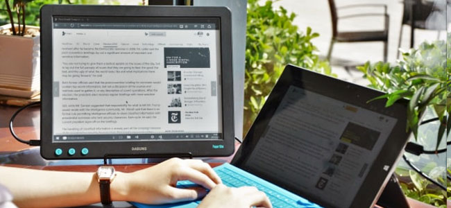 Damit kann man auch bei direkter Sonneneinstrahlung Texte am Notebook verfassen, ohne die üblichen Probleme mit der eingebauten LCD-Anzeige. Auch zur Stromersparnis kann die Anwendung des Dasung Paperlike potentiell sinnvoll sein: Nachdem man den Desktop dupliziert hat, kann man den LCD-Bildschirm deaktivieren.