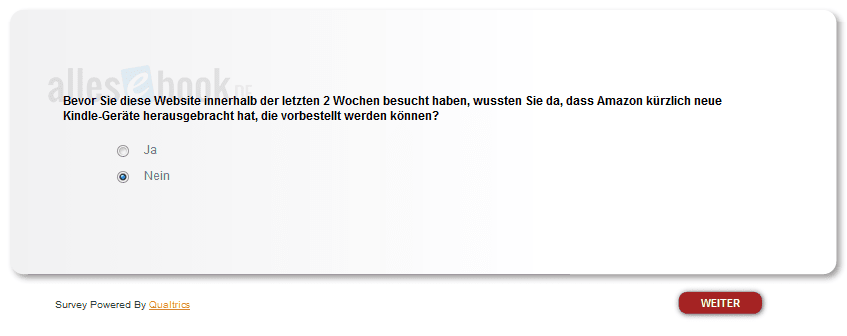 Wie Eingangs erwähnt steht die Einführung der nächsten eBook Reader Generation bei Amazon wohl kurz bevor. Das Unternehmen schickt aktuell Kundenzufriedenheitsumfragen zum Kindle aus, in denen auch folgende Frage gestellt wird „(…) wussten Sie da, dass Amazon kürzlich neue Kindle-Geräte herausgebracht hat, die vorbestellt werden können?“. Nun ist die Umfrage entweder schon ein Jahr alt, oder die nächste Neuvorstellung steht vor der Tür.