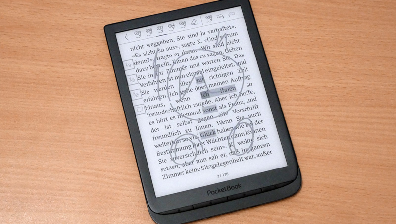 Außerdem hat sich auch die Optik geändert, d.h. anstatt nur ein einzeiliges Eingabefeld zu besitzen, ist das Textfeld nun mehrzeilig, losgelöst von der Tastatur und damit übersichtlicher. Wieder mit dabei und ebenfalls überarbeitet wurde der manuelle Notiznehmungsmodus. Damit lassen sich Markierungen oder Zeichnungen mit dem Finger direkt im Buch vornehmen. Das gab’s bei PocketBook zwar schon früher, wurde irgendwann aber gestrichen.