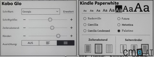 Der Kindle Paperwhite verfügt ebenfalls über gute Schriftanpassungsoptionen, kann aber mit dem Umfang eines Kobo Glo nicht mithalten. Am Paperwhite lassen sich Schriftart, Schriftgröße, Zeilen- und Randabstände einstellen, wobei man zusammenfassend sagen kann, dass dies nicht in so großem Umfang möglich ist, wie am Glo. Eine Anpassung der Textausrichtung (Blocksatz) oder Schriftdicke ist nicht möglich und auch eigene Schriftarten können nicht so einfach nachinstalliert werden, wie am Kobo Glo. Silbentrennung beherrscht der Paperwhite bisher keine.