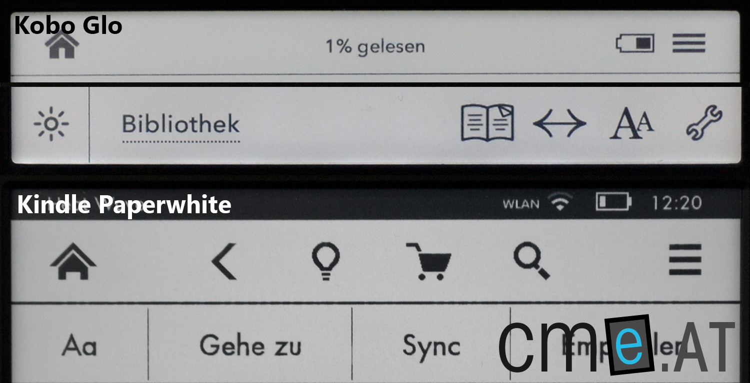 Beim Kobo Glo (oben) verteilt sich die Navigation auf den oberen und unteren Bildschirmrand, beim Kindle Paperwhite (unten) gibt es eine Hauptnavigation am oberen Bildschirmrand