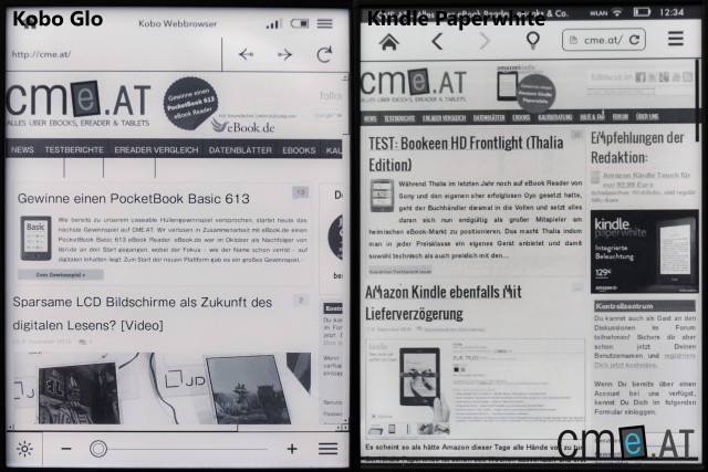 Der Internetbrowser des Kindle Paperwhite (rechts) ist eine Spur besser als der des Kobo Glo (links)