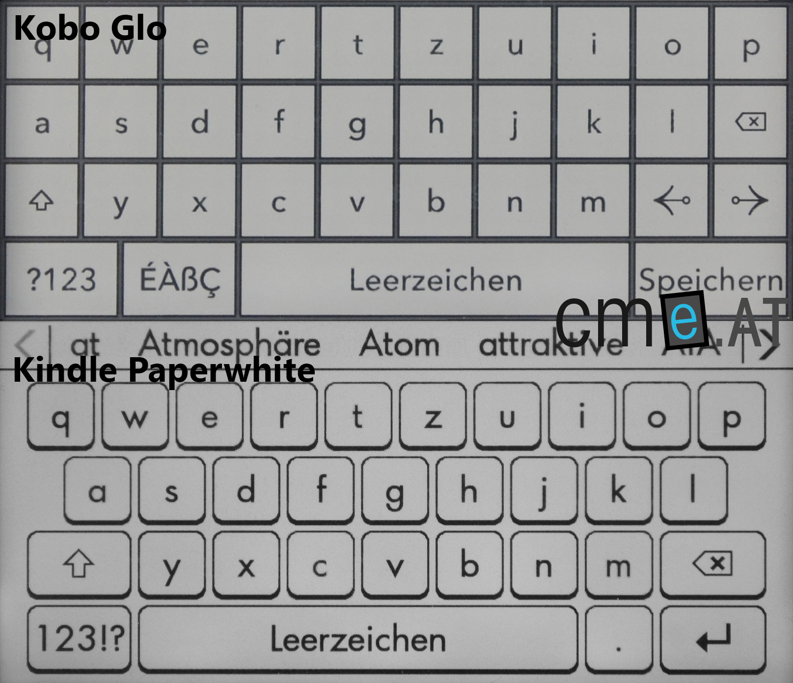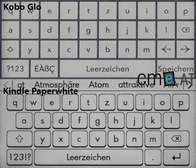 Trotz dieser beiden Mängel muss man klar sagen, dass die Wörterbuchfunktion am Kindle Paperwhite einfach besser ist. Auch in Hinblick auf die Tastatur kann der Kindle Paperwhite überzeugen. Das Tastenlayout ist ansprechender, aber besonders die Reaktionsfreudigkeit der Tastatur ist merklich besser. Auch schnelle Eingaben können getätigt werden, ohne dass Tastenschläge nicht erkannt werden. Am Kobo Glo sieht das leider ganz anders aus. Tippt man dort zu schnell auf den Bildschirm, werden einzelne Buchstaben oft verschluckt. Besonders ärgerlich ist dies auch deshalb, da man den Cursor nicht einfach mit einem Antippen versetzen kann, sondern Pfeiltasten auf der Tastatur nutzen muss. Das ist zeitraubend und kompliziert und bei einem Touchscreen-Gerät eigentlich völlig unnötig.