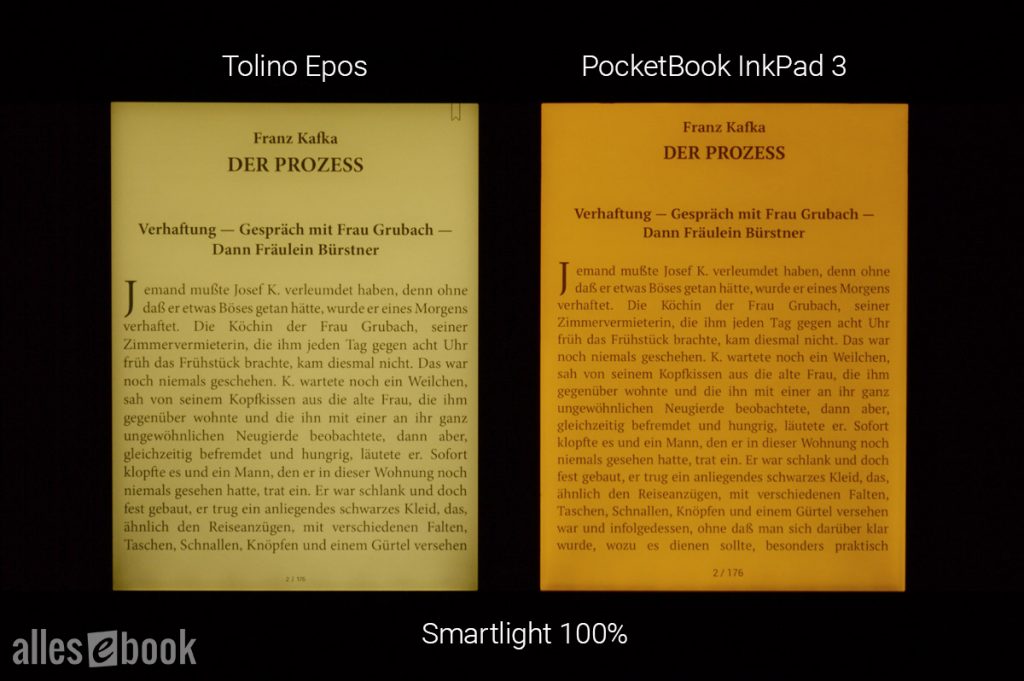 Im Vergleich zum Tolino Epos fällt der gelblichere Farbton des Konkurrenten auf, der wiederum näher am Tolino Vision 4 HD liegt. Keine der beiden Lösungen ist in meinen Augen besser oder schlechter, sondern eine Frage des persönlichen Geschmacks.