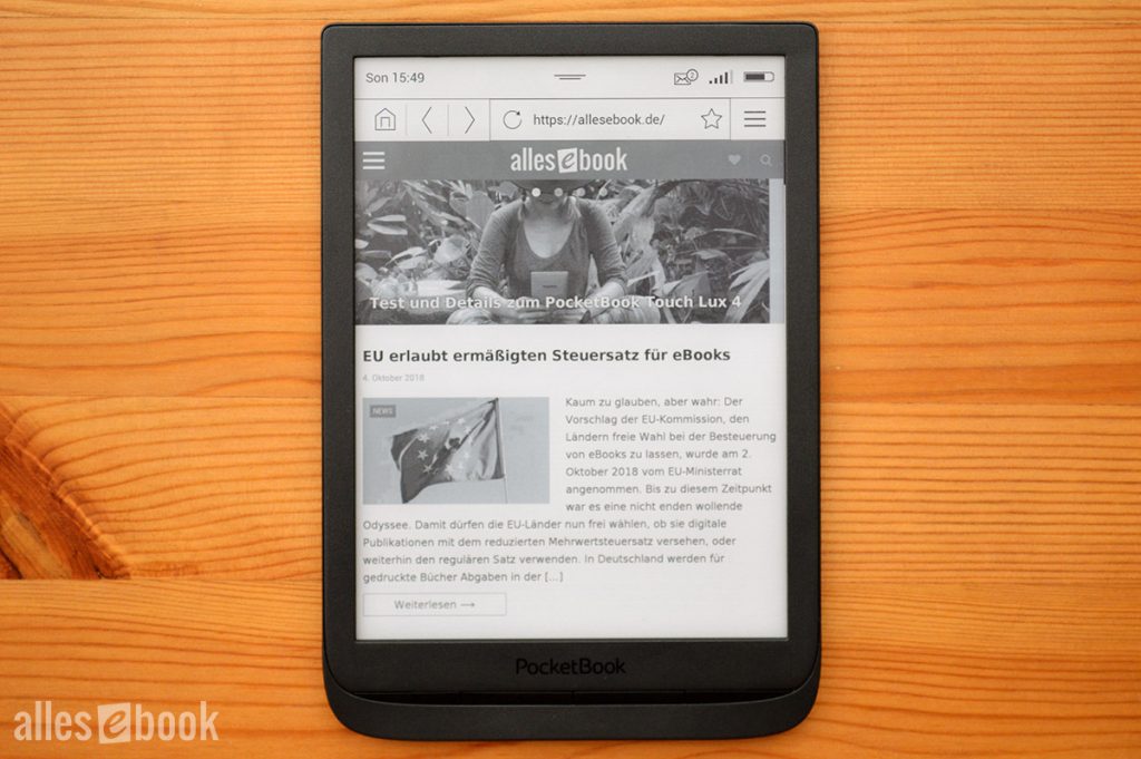 Beim Internet-Browser versteckt sich PocketBook nicht hinter irgendwelchen „Beta“-Bezeichnungen, wie das mitunter bei anderen Herstellern der Fall ist. Der Browser ist direkt auf der Startseite positioniert und steht dementsprechend stärker im Fokus. Dieser ist ausreichend schnell für kurze Recherchen im Internet und kann auch dazu verwendet werden, einen alternativen eBook-Store aufzusuchen oder die Onleihe zu verwenden.