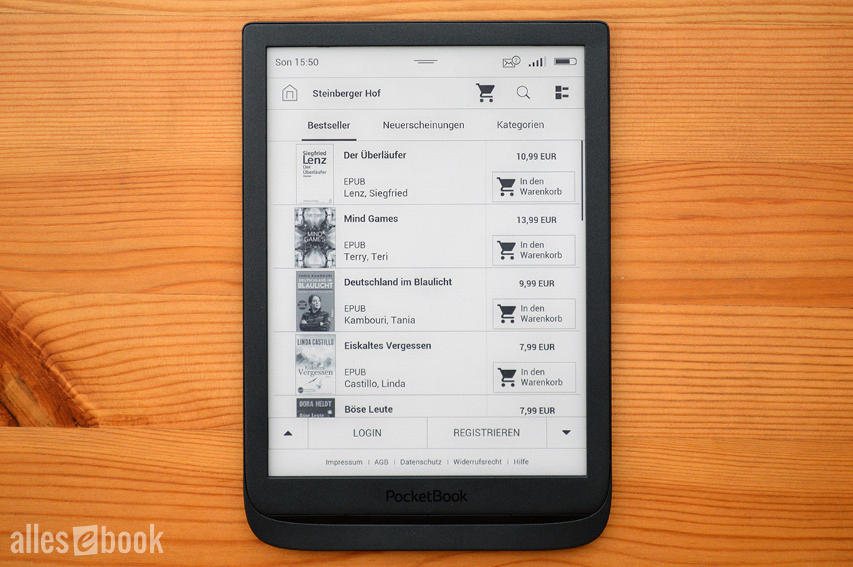 eBooks können selbstverständlich auch direkt am PocketBook InkPad 3 gekauft werden. Als Standard kommt der Bookland-Shop zum Einsatz, oder der Store des Buchhändlers, bei dem man das Gerät gekauft hat. Die Verwendung erfolgt grundsätzlich gleich und ist in die PocketBook Cloudlösung integriert.