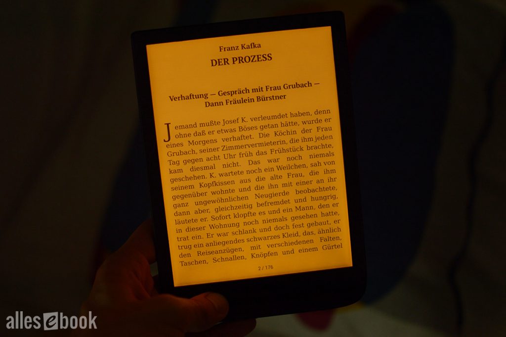 Ein interessantes Verhalten legt das PocketBook InkPad bei der minimalen Helligkeit an den Tag: In den niedrigsten Einstellungen werden automatisch die orangen LEDs hinzugeschaltet, unabhängig von der Smartlichteinstellung. Das ist zunächst zwar überraschend, macht aus Nutzersicht aber durchaus Sinn. Üblicherweise will man besonders niedrige Helligkeitseinstellungen lieber abends und in der Nacht nutzen, weshalb die erzwungene Blaulichtreduktion keine schlechte Sache ist.