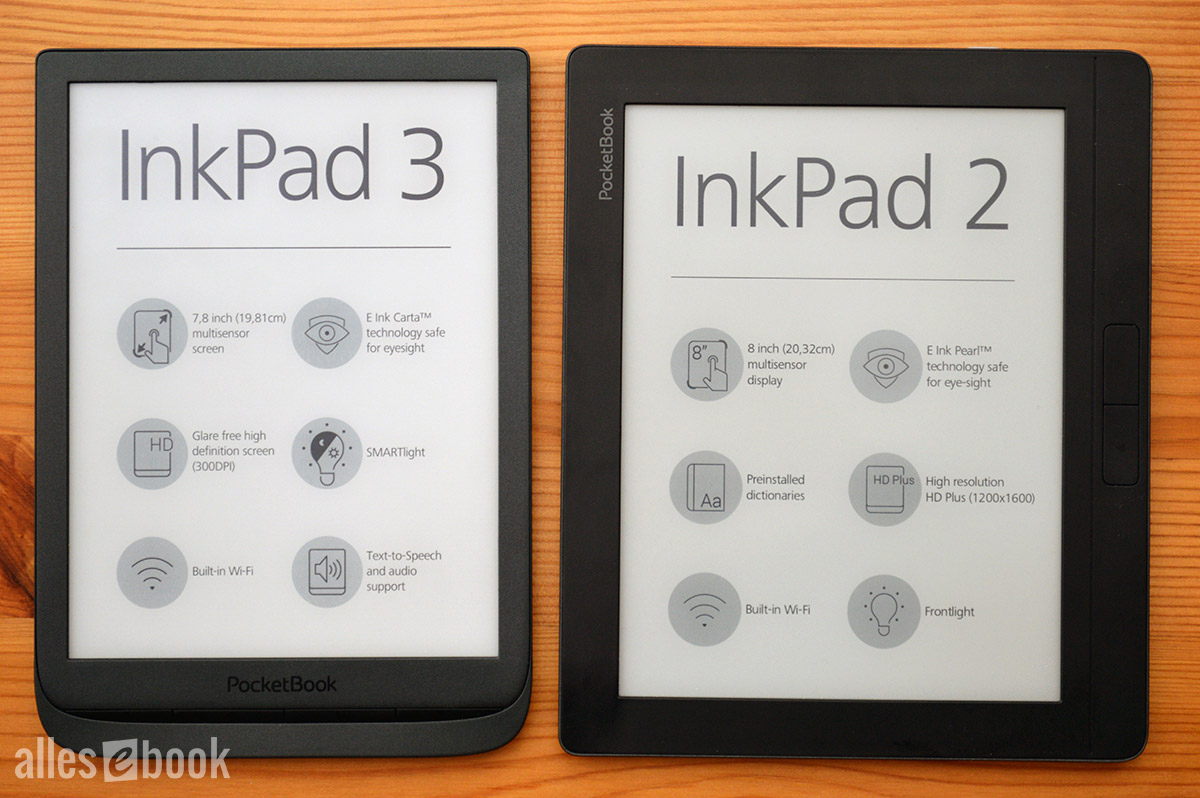 Das PocketBook InkPad 3 bietet im Vergleich zu den beiden Vorgängern hinsichtlich des Displays einige Neuerungen: Die Bildschirmdiagonale ist um 0,2 Zoll kleiner, bei der Technik kommt nun E-Ink Carta zum Einsatz, die Beleuchtung erlaubt eine Reduktion des Blaulichtanteils und die Pixeldichte beträgt anstatt 250 ppi nun 300 ppi.