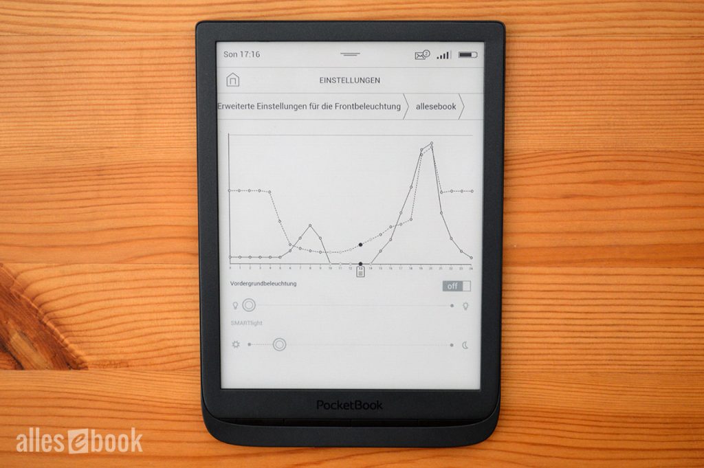 Die Farbtemperatur des PocketBook InkPad 3 lässt sich anpassen. PocketBook nennt die Blaulichtreduktion, ebenso wie die Tolino-Allianz, „Smartlight“.