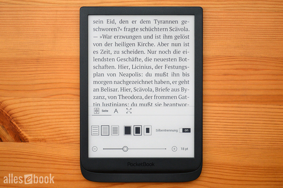 Im Buch angekommen, blättert man entweder mit den Blättertasten unter dem Bildschirm, oder mit einem Antippen oder Wischen des Touchscreens. Besonders praktisch erweist sich in diesem Zusammenhang auch der automatische Lagesensor. Aufgrund der Bildschirmgröße empfinde ich die seitliche Haltung manchmal als angenehmer und kann das Gerät unkompliziert drehen, sodass mein Daumen direkt auf den Blättertasten aufliegt.