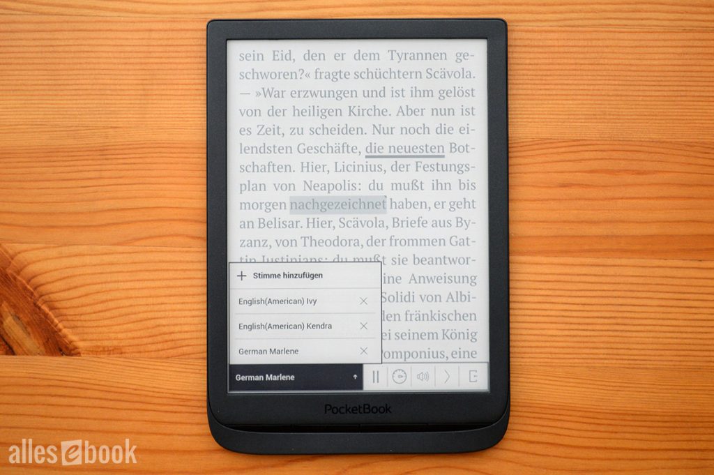 Die Text-To-Speech-Funktion lässt sich in einem Buch über den Menüpunkt „Stimme“ aktivieren. Die Bedienelemente werden am unteren Bildschirmrand eingeblendet. Für zahlreiche Sprachen kann man direkt am Gerät verschiedene männliche und weibliche Stimmen herunterladen. Download und Installation nehmen ca. 2-3 Minuten in Anspruch. Wahlweise bekommt man die Sprachpakete auch kostenlos auf der PocketBook-Webseite. Eine englische, weibliche Stimme ist bereits vorinstalliert.