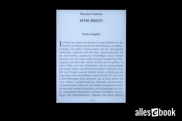 Das Ghostingverhalten des PocketBook InkPad 4 ist sehr gut und ebenso wie beim Era etwas besser als bei den E-Ink Carta 1200 Konkurrenten. Ein sehr schwaches „Durchscheinen“ der vorigen Seite ist zwar erkennbar, man muss allerdings schon aktiv danach suchen.
