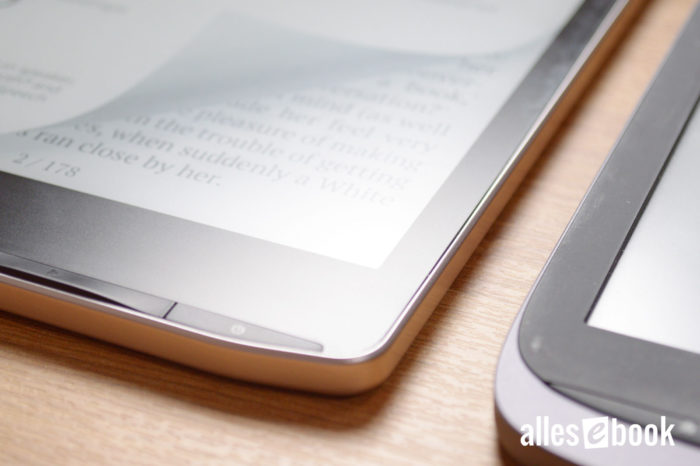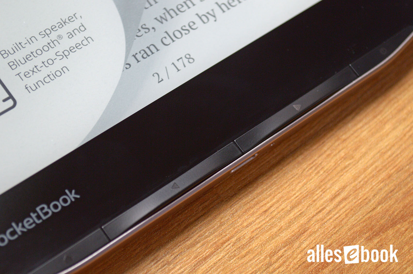 Weiterhin wird das Display rundum von einem schmalen Rahmen eingefasst, lediglich darunter ist dieser für eine größere Angriffsfläche höher. An der Stelle sitzen auch die für PocketBook typischen Hardware-Knöpfe.