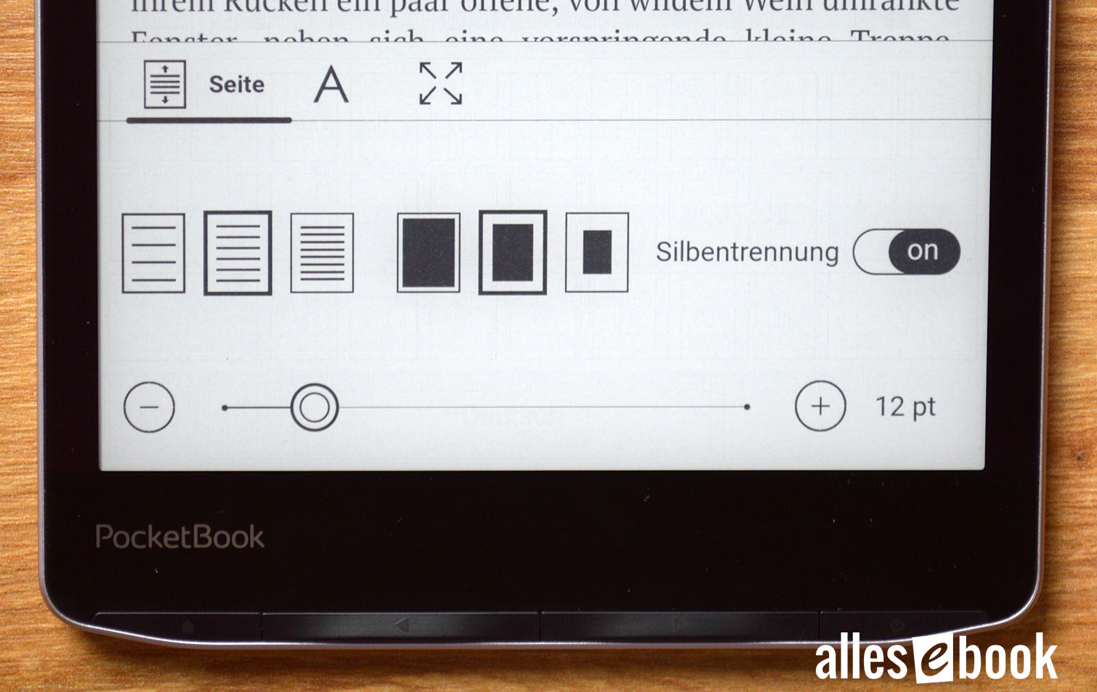 Wie bei PocketBook inzwischen üblich, lässt sich die Frontbeleuchtung außerdem zwischen kalt-weiß und warm-orange adaptieren. Im konkreten Fall geht die warme Lichtfarbe aber eigentlich nicht ins orange-rötliche wie bei den Vorgängern, sondern eher ins gelbliche. Das ist nicht besser oder schlechter als bisher, sondern soll lediglich als „Gut zu wissen“-Information Erwähnung finden. Die Reduktion des blauen Lichtanteils klappt damit jedenfalls ebenfalls wunderbar.