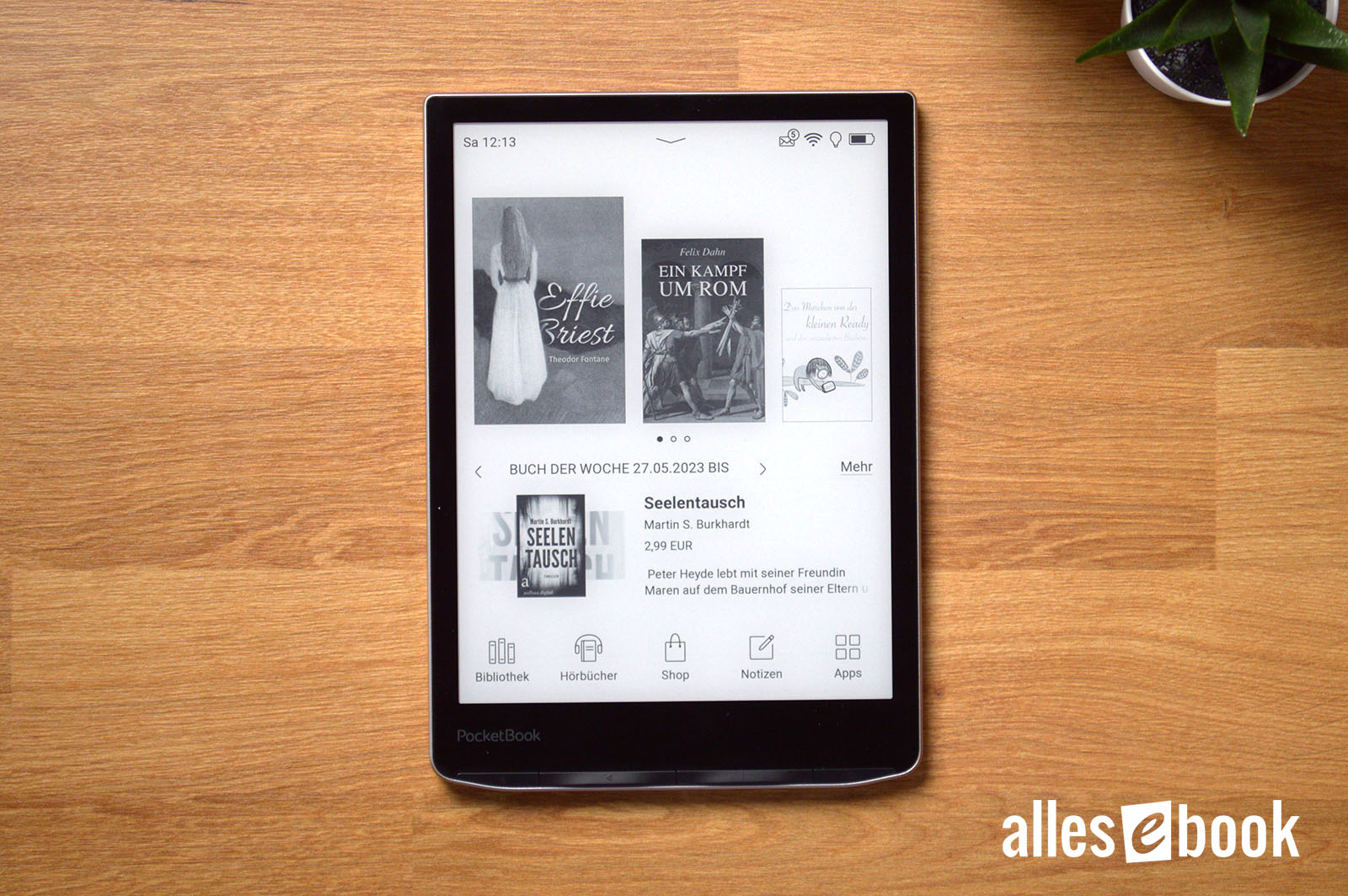 Auf dem Startbildschirm wird das gewohnte PocketBook-Layout beibehalten: Oben werden die drei zuletzt gelesenen oder hinzugefügten Titel angezeigt, darunter erscheinen Empfehlungen aus dem integrierten eBook-Shop.