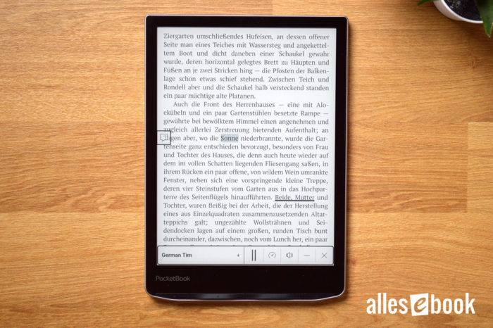 PocketBook unterstützt bereits seit einiger Zeit die Audiowiedergabe über Bluetooth. Der nun eingebaute Lautsprecher verstärkt diesen Fokus nochmal deutlich.