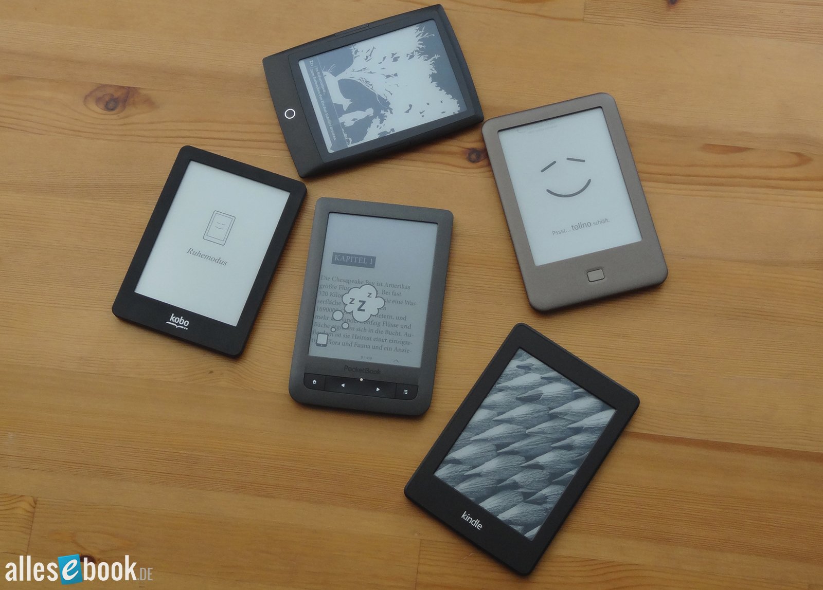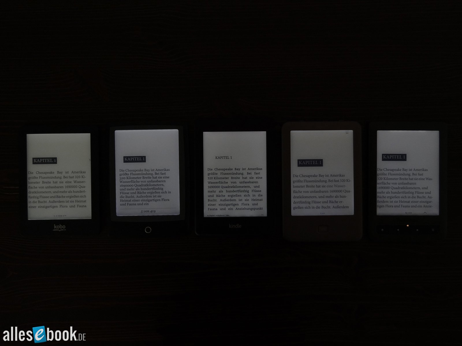 Jeder Beleuchtungs-Reader hat seine eigene Färbung. Der PocketBook Touch Lux (rechts außen) leuchtet bläulich