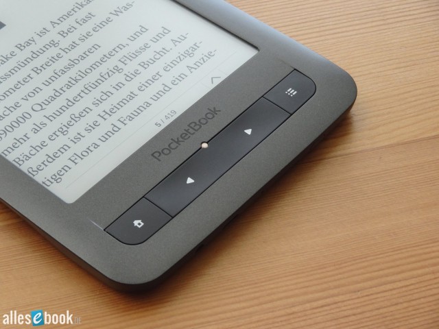 Während fast alle anderen Hersteller auf ein knopfloses Design bauen, nutzt der PocketBook Touch Lux weiterhin die Bedienung über Tasten – zusätzlich zum Touchscreen versteht sich. Die Tasten sitzen allesamt direkt unter dem Bildschirm: Home, Zurück(blättern), Vorwärts(blättern), Menü. Eine Besonderheit der PocketBook Geräte ist die Möglichkeit die Tastenfunktionen selbst festzulegen – später dazu mehr. Die Knöpfe haben einen guten Druckpunkt, sind nicht zu laut und greifen sich angenehm an. Mittig zwischen Tasten und Bildschirm befindet sich eine Status-LED, welche den Aktivitätsstatus des Prozessors bzw. den Aufladestand anzeigt und sich optional deaktivieren lässt.