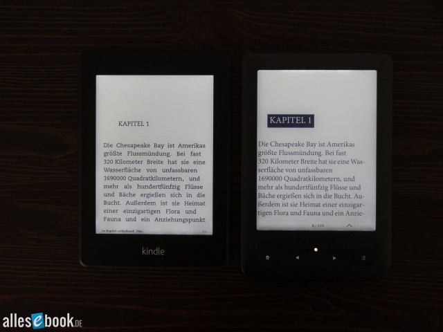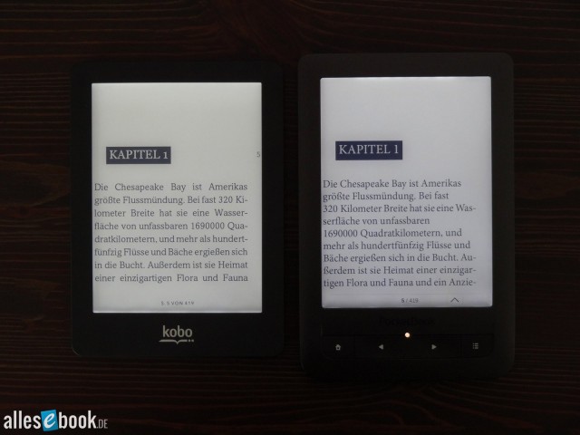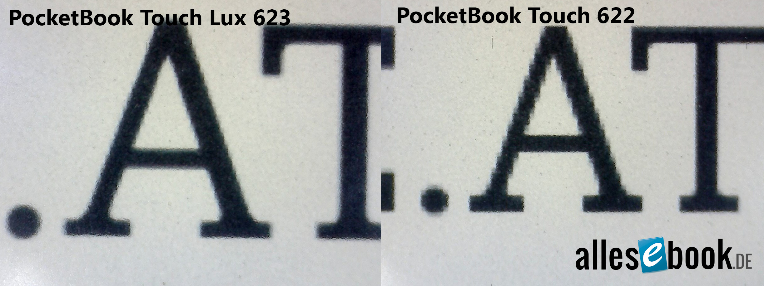 Im nachfolgenden Bild sehr gut erkennbar, ist die bessere Kantenglättung im Vergleich zum PocketBook Touch 622. Die Kantenschärfe ist aufgrund der Lichtträgerfolie allerdings etwas geringer. Bei normaler Textgröße wirkt der Bildschirm des PocketBook Touch Lux etwas schärfer, den wahren Mehrwehrt der höheren Auflösung sieht man aber hauptsächlich bei kleineren Schriftgrößen und bei PDF-Dateien und Bildern.
