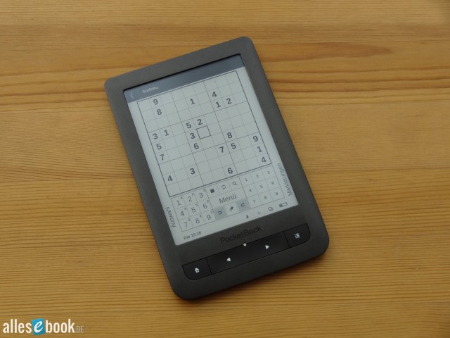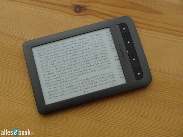 Die Punkte des Optionsmenüs würden wir uns nach wie vor (wie schon beim PocketBook Touch 622) direkt in der Titelleiste wünschen. So könnte man sich einen Klick ersparen, um die oben genannten Funktionen aufzurufen, was am relativ langsamen eInk-Display auf jeden Fall ein Vorteil wäre.