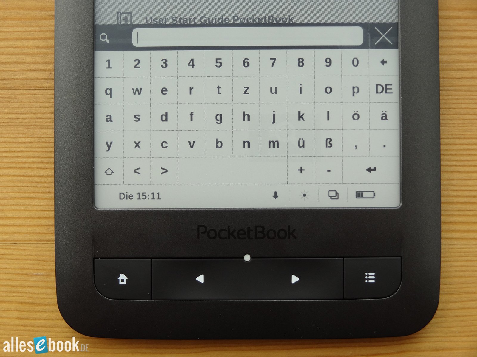 Am oberen Bildschirmrand kann man außerdem noch die Suchfunktion über das entsprechende Symbol aufrufen. Die Suchergebnisse werden im gleichen Format angezeigt, wie zuvor in der Bibliotheksoption ausgesucht. Suchbegriffe werden über die virtuelle QWERTZ-Tastatur eingegeben. Die Tastatur verfügt über ein ausgezeichnetes Tastenlayout und eine gute Reaktionsgeschwindigkeit, sodass die Eingabe kinderleicht von der Hand geht. Alle Buchstaben, Umlaute und wichtige Satzzeichen sind direkt ohne Umwege anwählbar. Außerdem kann man mittels Knopfdruck zwischen verschiedenen vorher ausgewählten Sprachlayouts wechseln.
