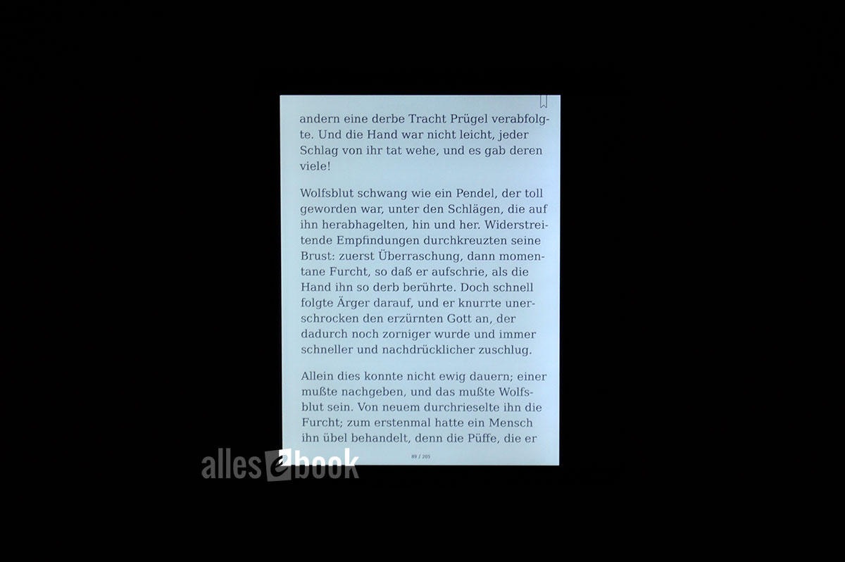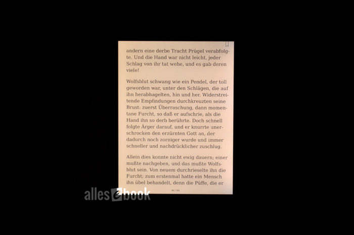 Mit der unteren Taste wird vorwärts geblättert, mit der oberen Taste geht’s zurück. Diese Belegung lässt sich auch umdrehen. Außerdem kann innerhalb der Leseanwendung auch der Touchscreen deaktiviert werden.