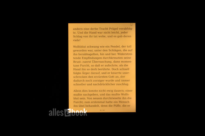 Aktiviert man den Nachtmodus und wechselst ins Buch, wird aber schnell klar, wieso sich dieser auf eReadern bisher nicht durchgesetzt hat: Der Ghosting-Effekt ist deutlich ausgeprägt. Am dunklen Bildschirmhintergrund ist dieser stärker sichtbar als mit schwarzem Text.
