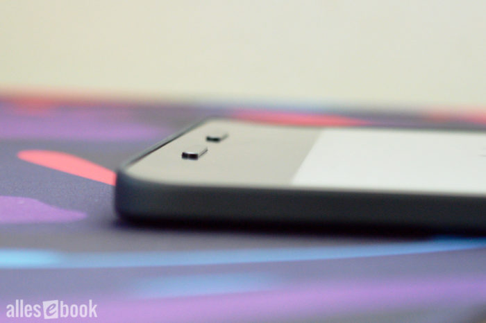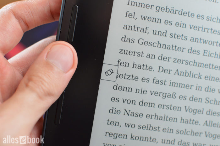 Wieder mit dabei sind die Blättertasten, die in die Nähe des Randes gerückt sind. Das hat Vor- und Nachteile: Weil ich meinen Daumen tendenziell eher mittig ablege, kam es so nie zu unbeabsichtigtem Umblättern und die glatte Oberfläche unter dem Daumen fühlt sich komfortabler an, andererseits fällt die Bewegung zum Umblättern nun zwangsläufig aber etwas größer aus als zuvor.