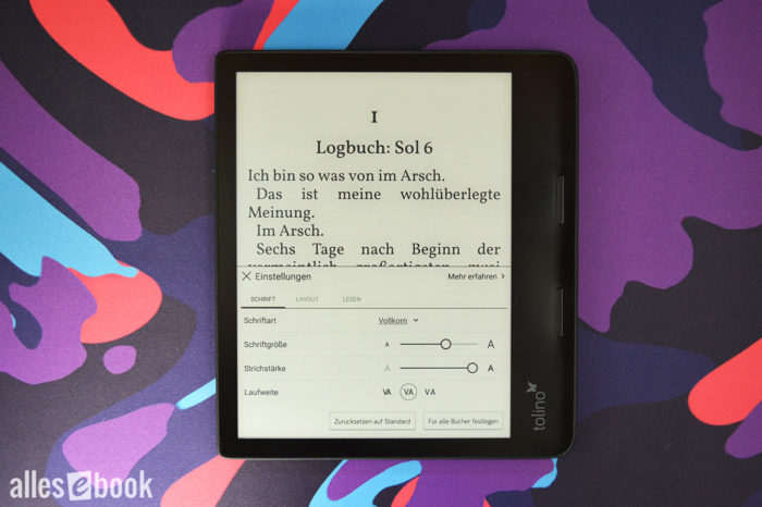 In der Tolino-Software setzt man stattdessen auf einen einfacheren Zugang: Mit einem Schalter aktiviert man die automatische Anpassung lediglich. Weitere Optionen gibt’s dafür nicht.