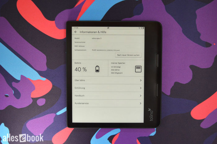 Den Tolino Epos 3 habe ich zuletzt mit Firmware 15.4.0 getestet. Hiermit hatte ich mit dem eReader erfreulicherweise keine Stabilitätsprobleme. Insbesondere das erwähnte Touchscreenproblem trat nicht auf. Lediglich mit der Vorserien-Firmware 15.0.0 stürzte mir die Tolino-App bei erstmaligem Öffnen eines Wörterbuches einmal ab.