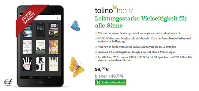 Bereits in der ersten Jahreshälfte wurde der Preis des Tolino Tab 8″ angepasst: Zuerst bot Weltbild das sehr gut getestete Tablet günstiger an, kurze Zeit später folgte auch eBook.de. Für nur 149 Euro war das Gerät erhältlich. Nun gibt’s eine neue, vermutlich wieder kurzfristige Preissenkung, sodass man Thalia aktuell nur 99 Euro für den Tolino Flachcomputer auf den virtuellen Ladentisch legen muss.
