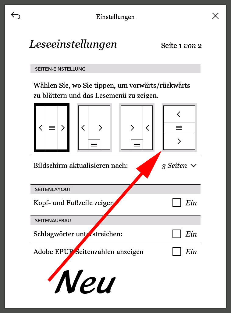 Neue Touchzone zum Blättern: Die bisherign drei Einstellungsmöglichkeiten die Touchzonen zum Umblättern anzupassen, wurden um eine vierte Option ergänzt. Damit befindet sich das Vorwärtsblättern nun optional in der unteren Hälfte des Bildschirms (siehe Bild), was die einhändige Bedienung erleichtern dürfte.